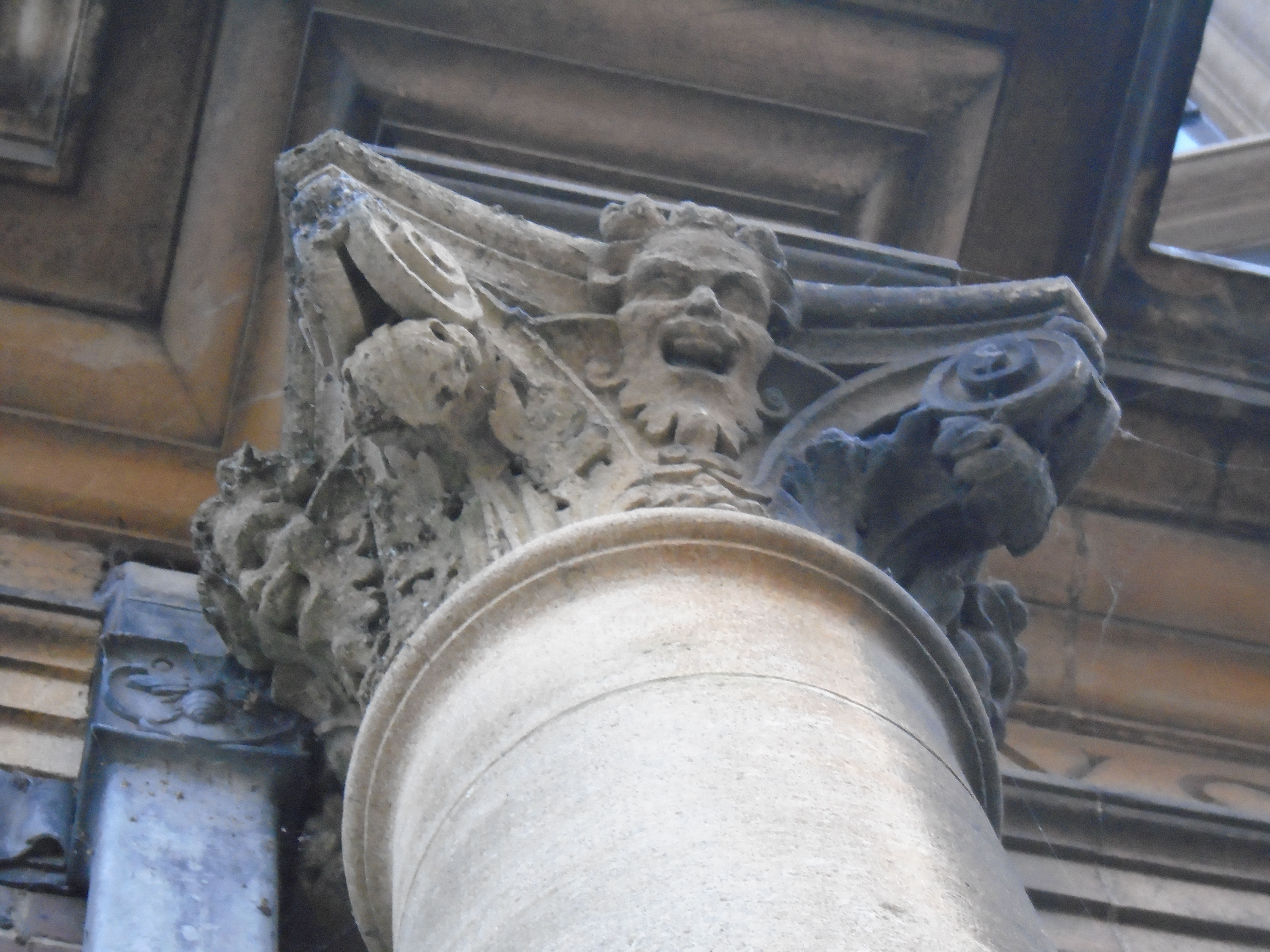 These gren men (and a lion) are above the entrance of the Downing site. These are monsters (myths?) which can be found in medieval churches, although here they are Victorian. The pillars have grining faces as well.