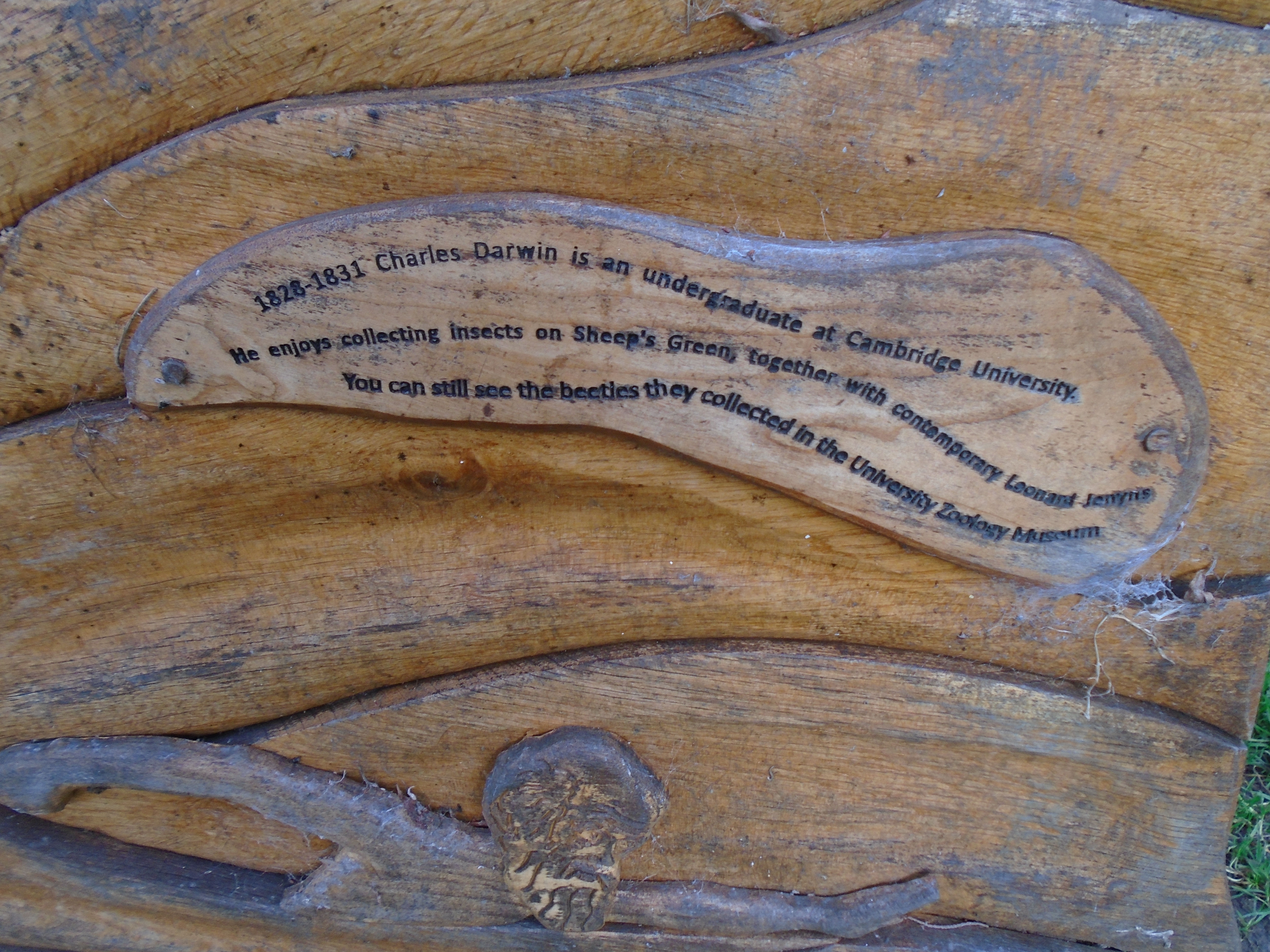 There is a learner pool on Sheeps Green. There used to be swimming in the river. This modern pool is heralded by this splendid sign/bee hotel. The sign says "1828-1831 Charles Darwin is an undergraduate at Cambridge University. He enjoys collecting insects on Sheeps Green together with contemporary Leonard Jenyns. You can still see the beetles they collected in the University Zoology Museum."