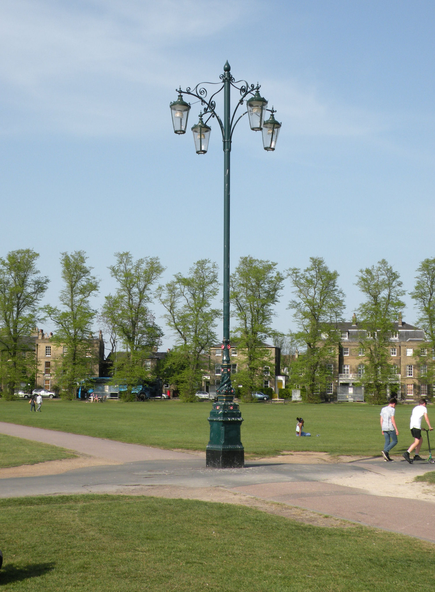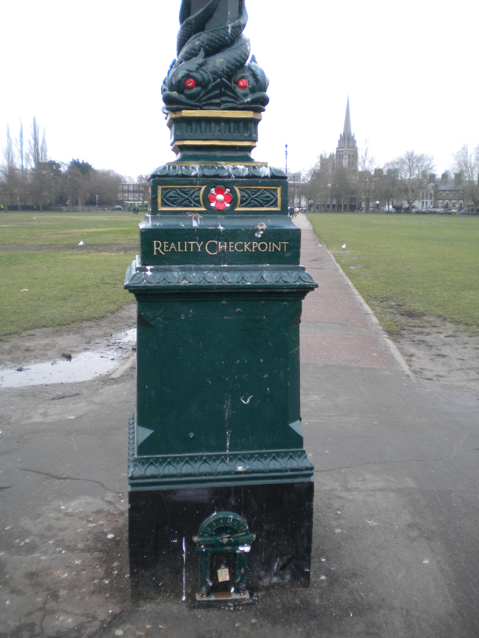 The lamp standard in the middle of Parkers Piece is called Reality Checkpoint. It is listed grade II, and dates from 1894. there are various reasons given for the name. It is considered to be at the border between Cambridge University and the Town, so if students visited the town, this was where they had to "check their reality". Another suggestion is that this used to be the only lamp on Parkers Piece, and if there was fog, you could feel lost until you came across the lamp. Now there are six modern lamps as well, which were deliberately made in a similar style.