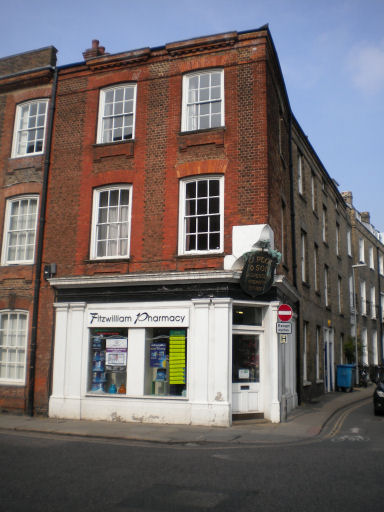 30 Trumpington St is the chemist on the corner of Fitzwilliam Street, built 1727. It is listed grade II*. The sign over the door says "The sign over the door says G. Peck & Son Dispensing Chemists Est. 1851". It's good to see that it's still a chemist.