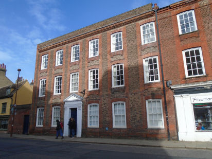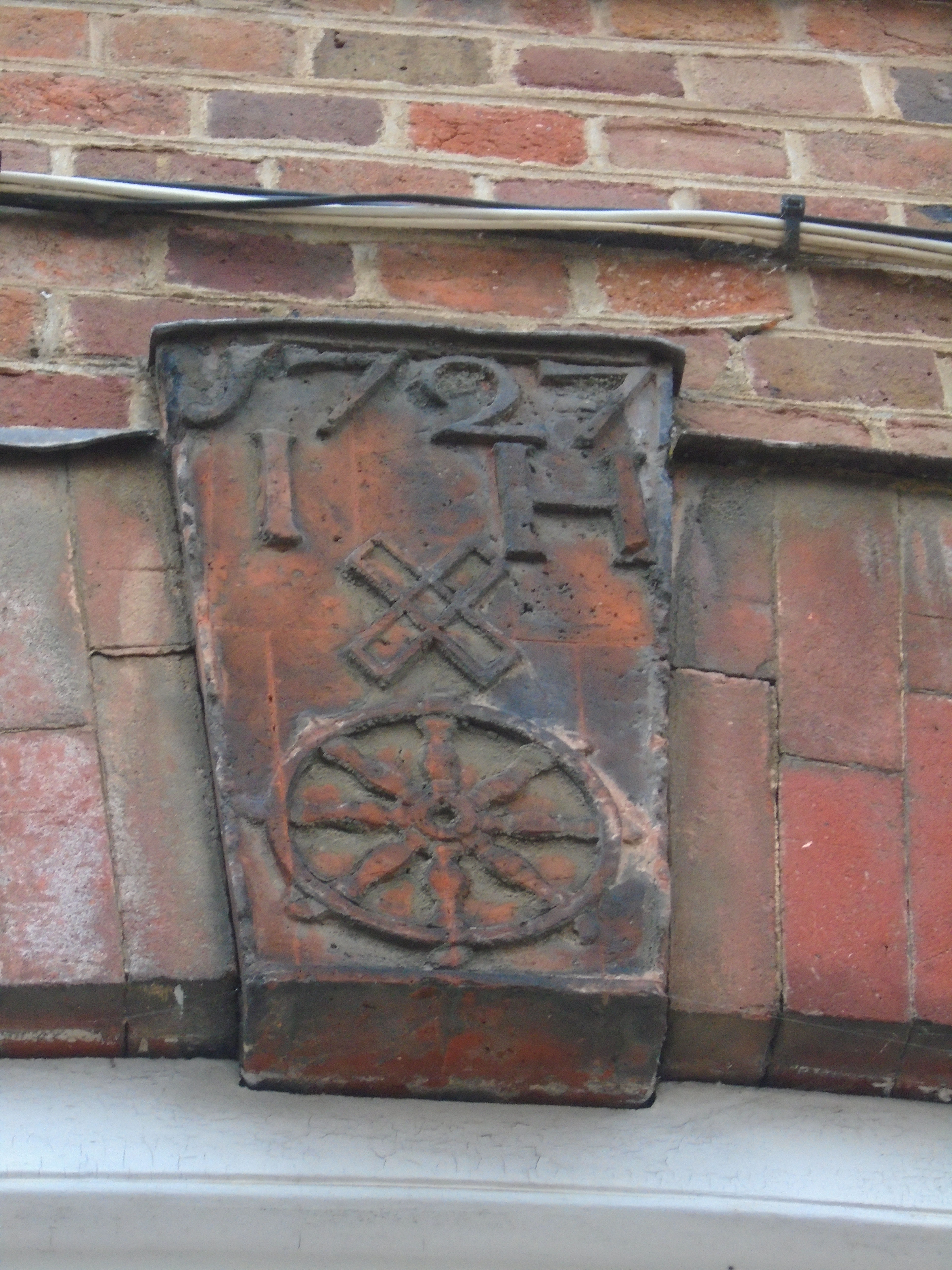 31 Trumpington Street (Fitzwilliam House) was built in 1727 and is grade II*. It used to be called Fitzwilliam Hall, and was a non-collegiate institution for poor students from 1874-1963. This institution became Fitzwilliam College in 1966, and moved up Castle Hill. This plaque is above the right-most ground floor window. It says "1727 IH X" and a catherine wheel. It was originally thought to be something to do with St Catherine's College, but there is an alternative explanation. The house was owned by John Halstead (hence the "I H"). He was a brewer. Brewers were accustomed to masrk barrels of the correct size with X, and from the fourteenth century, some breweries were named The Catherine Wheel.