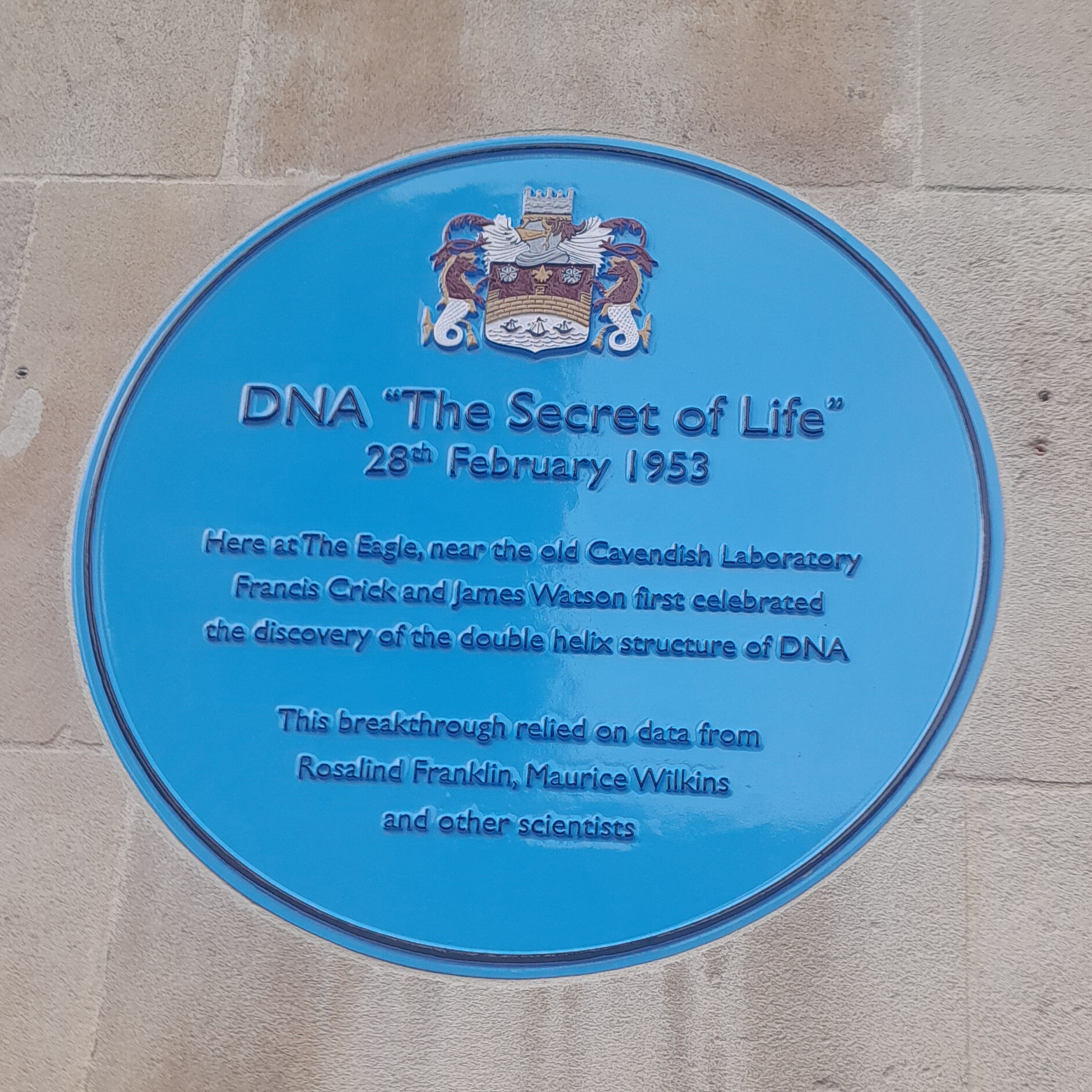 The Eagle pub (listed Grade II) dates from around 1600. It was used by American servicemen in WWII. Later, Francis Crick and James Watson discovered the structure of DNA in the Old Cavendish site. Once they had made this discovery, they crossed Benet Street to the nearest pub, the Eagle, to celebrate. As they walked into the Eagle, Crick announced "We have found the secret of Life." A blue plaque outside the pub celebrates this. The original plaque only mentioned Crick and Watson. There was a fuss about this, so it has been replaced by a new plaque, which also references Rosalind Franklin and Maurice Wilkins, the scientists working in London, and "other scientists".