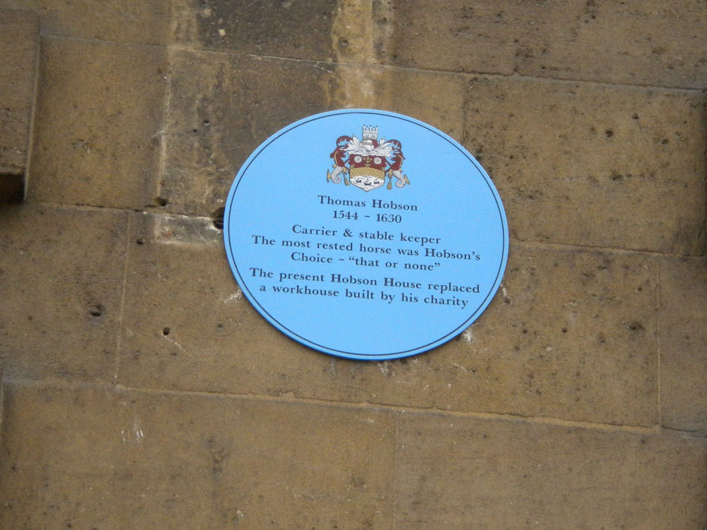Turn right onto Regent Street. On the left, there is Hobson House (about to be made into a hotel). A blue plaque on the wall says 'Thomas Hobson 1544-1630 Carrier and stable keeper. The most rested horse was Hobson's Choice - "that or none". The present Hobson House replaced a workhouse built by his charity.'