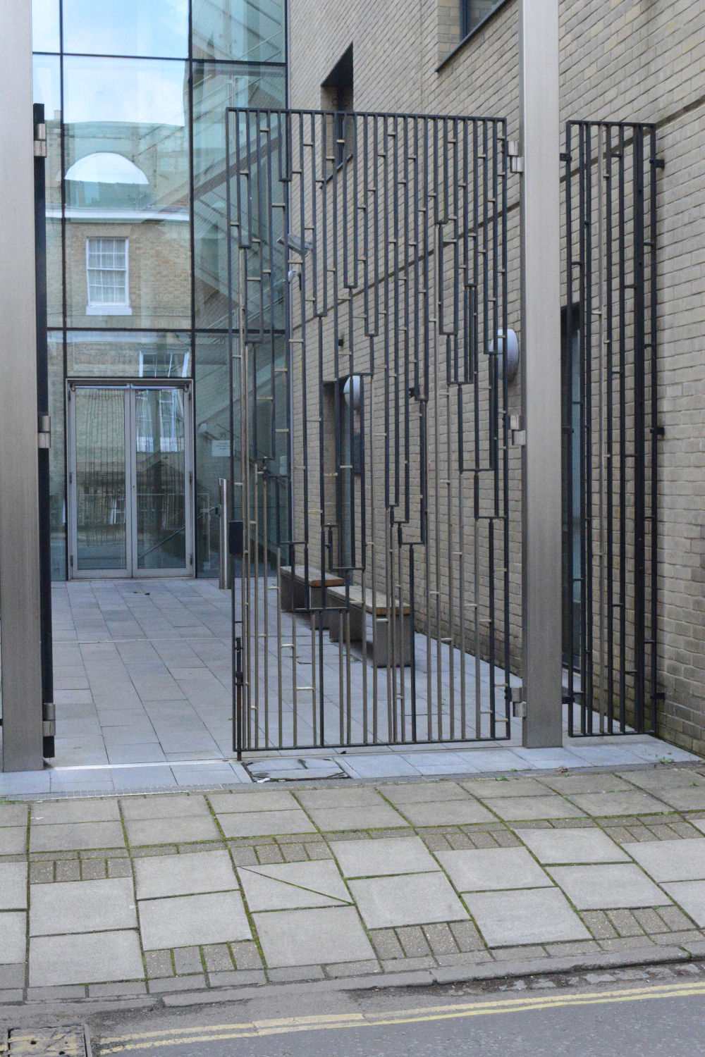 This Darwin window and gate are at the Leverhulme Centre for Human Evolutionary Studies in Fitzwilliam Street. The window is a quotation from The Origin of Species: "How do those groups of species arise? All these follow from the struggle for life. Owing to this struggle, variations, however slight and from whatever cause proceeding, if they be in any degree profitable to the individuals of a species, in their infinitely complex relations to other organic beings and to their physical conditions of life, will tend to the preservation of such individuals, and will generally be inherited by the offspring. The offspring, also, will thus have a better chance of surviving, for, of the many individuals of any species which are periodically born, but a small number can survive. I have called this principle, by which each slight variation, if useful, is preserved, by the term natural selection. We have seen that man by selection can certainly produce great results, and can adapt organic beings to his own uses, through the accumulation of slight but useful variations, given to him by the hand of Nature. But Natural Selection, we shall hereafter see, is a power incessantly ready for action, and is as immeasurably superior to man's feeble efforts, as the works of Nature are to those of Art." The gate looks like it is inspired by an evolutionary tree diagram.