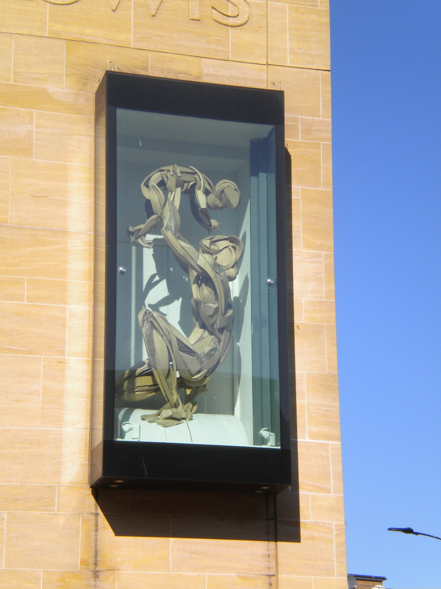 This sculpture is on the side of the John Lewis building, between Downing Street and St Andrews Street. It faces Downing Street, and is quite high up the building. It is called Mother and Child, by Sophie Dickens, and is dated 2008. It is made of carved wood.